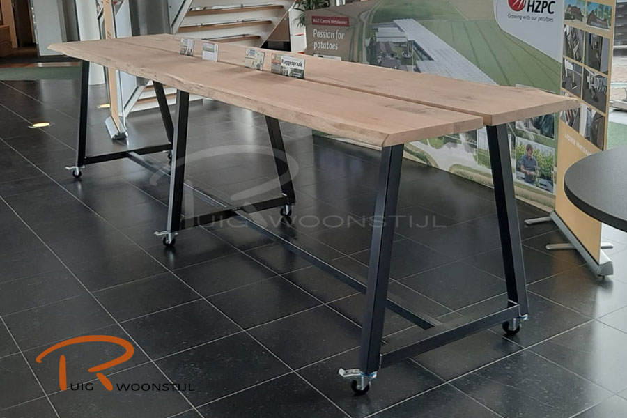 Een mooie combinatie tussen modern en industrieel. Tijdloos en oerdegelijk is de doelstelling, Yoek is standaard voorzien van functionele kaartenbak. U kunt kiezen uit de vele soorten tafelbladen die we leveren, op de foto ziet u massief eiken met de buitenzijde onbekantrecht. Uiteraard zijn vele andere onderstellen samen met Robbert uit te tekenen, standaard leveren we de tafel zonder wielen.
