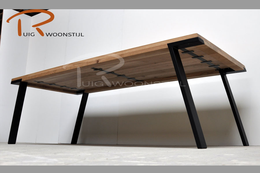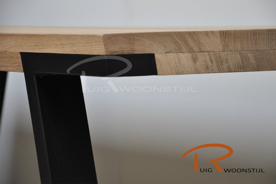 Ons meest recente en misschien ook wel meest bijzondere model als het gaat om styling, exclusief en handgemaakt in de werkplaats van RUIG Woonstijl. De geschuinde poten en het kopse aanzicht van de tafel accentueren dit ingenieuze ontwerp. Stoer, modern en heel eigentijds. Veel freeswerk is verricht en zware u-profielen zijn ingelegd om voor een leven lang een perfect vlak resultaat te creëren. Bepaal zelf de ral-kleur van uw onderstel, wij poedercoaten krasvast binnen 5 werkdagen. Kies uit een van de vele soorten fijnhout en laat tafel “Baaz” op maat maken of maak uw keuze uit deze meest geliefde houtsoorten in de prijslijst.