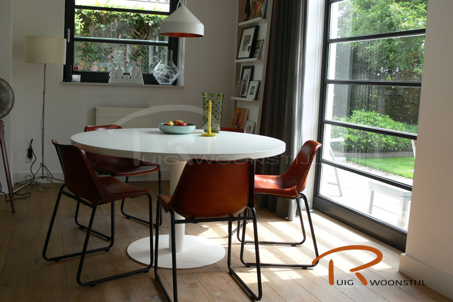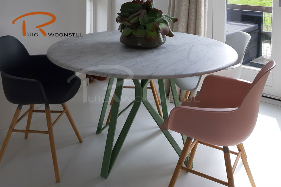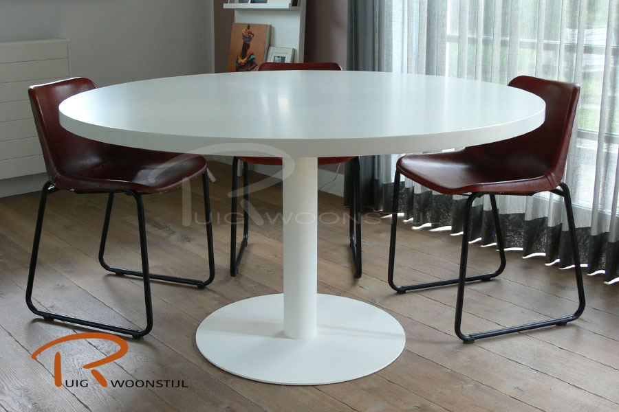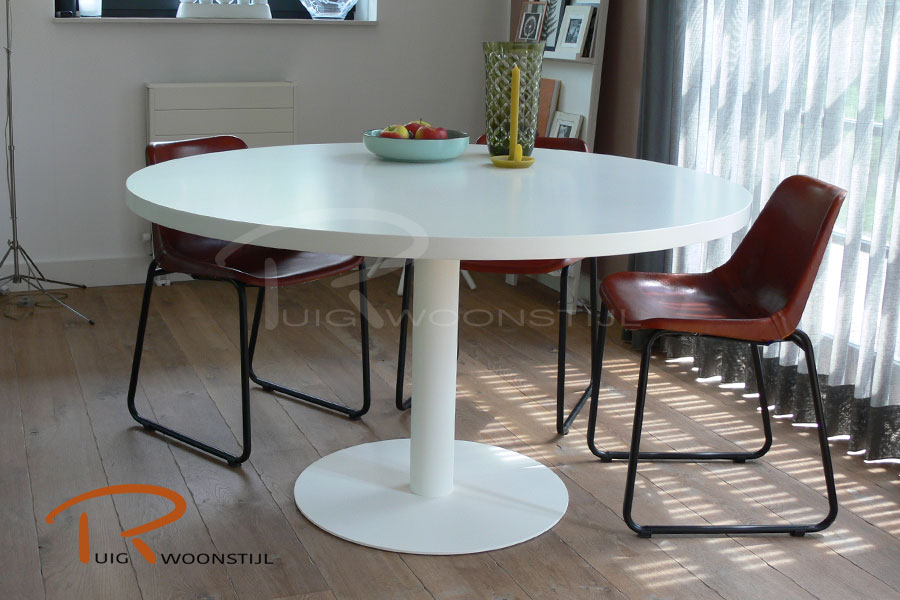 Ronde tafels zijn razend populair en geven een speelse, ruimtelijke touch aan de ruimte. Tafel “Juf” is voorzien van een zwaar metalen onderstel in kleur gecoat naar wens, voorzien van een 40mm dik rond tafelblad, perfect en professioneel gespoten in kleur naar wens. Nu ook verkrijgbaar met 10mm dik massief metalen blad, heel moderne look en een eindeloze levensduur worden hierbij gegarandeerd.